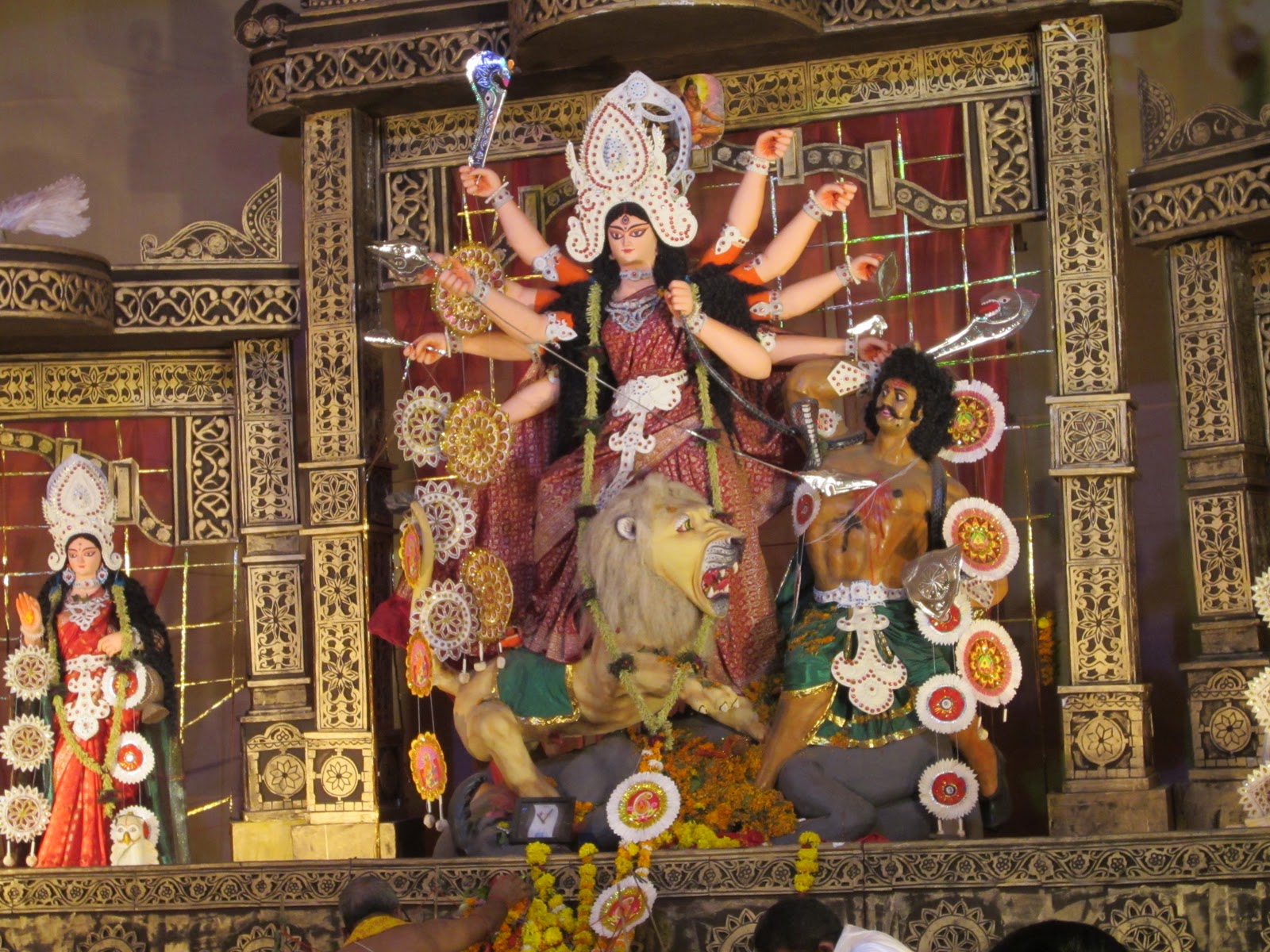 The annual Hindu festival of Durga Puja is in full swing. The streets of Veranasi are packed with worshipers of the goddess, who have come to offer food and flowers at her feet and visit the pandals (temporary temples) where they celebrate the goddess who saved the entire cosmos from destruction! Trucks packed with young men commandeer the narrow alleyways, blasting earsplitting chants and music in honor of the holiday. The best I can do is to keep my eyes open and "give" Marilyn my camera, setting her loose to follow her instincts...