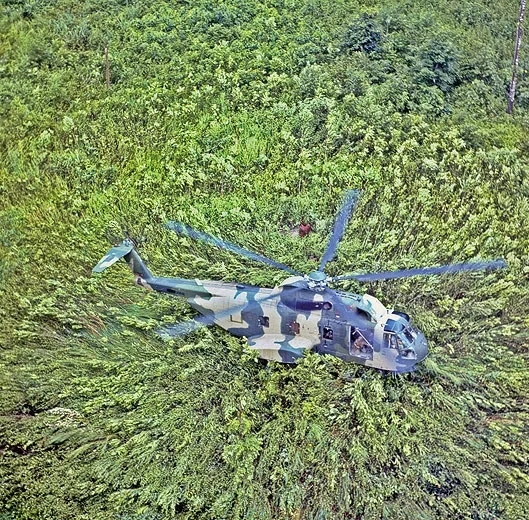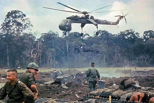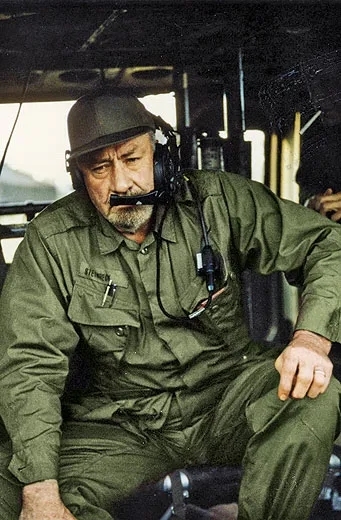 I watch their hands and their feet on the controls, the delicacy of the coordination reminds me of the sure and seemingly slow hands of [Pablo] Casals on the cello…. You will gather that we are now in V.C. country, where every tree may open fire and often does. Maj. Thomas dips into a stream bed cascading down a twisting canyon and you realize that low green cover you saw from high up is towering screaming jungle so dense that noonday light fails to reach the ground. The stream bed twists like a snake and we snake over it, now and then lofting like a tipped fly ball to miss an obstruction or cutting around a tree the way a good cow horse cuts out a single calf from a loose herd.