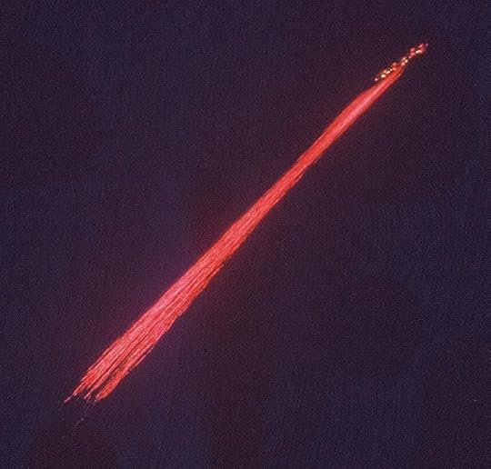 There was a line of afterglow in the western sky, only it was not west the way Puff flies. Sometimes it was overhead, sometimes straight down. Without an instrument you couldn’t tell up from down but my feet were held to the steel floor by the centrifuge of the turning, twisting ship. Then the order came and a flare was thrown out and another and another. They whirled down and the brilliant lights came on. We upsided and looked down on the ghost-lighted earth. Far below us almost skimming the earth, I could see the shape of the tiny skimming FAC plane inspecting the target and reporting to our pilot. We dropped three more flares, whirled and dropped three more. The road and the crossroads were very clearly defined on the ground and then there was a curious unearthly undulating mass like an amoeba under a microscope, a pseudo-pod changing in shape and size as it moved. Now Puff went up on its side. I did know enough to get my mouth open. The sound of those guns is like nothing I have heard. It is like a coffee grinder as big as Mt. Everest compounded with a dentist’s drill. A growl, but one that rocks your body and flaps your eardrums like wind-whipped flags. And out through the door I could see a stream, a wide river of fire that seemed to curve and wave toward the earth.
