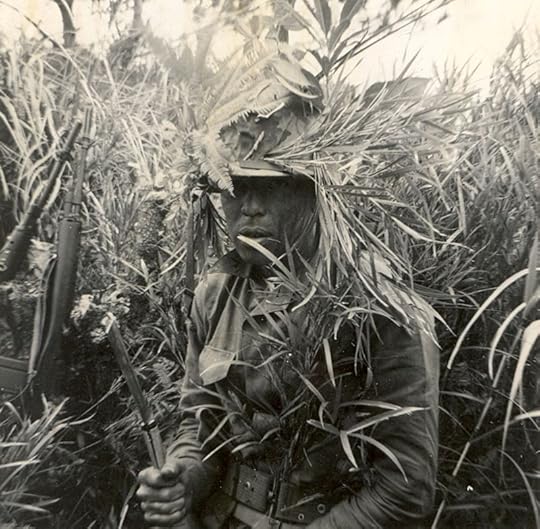 Harvey Pratt (Cheyenne and Arapaho, b. 1941) holds a Naga knife—a Southeast Asian knife used for cutting through vegetation—during the camouflage and evasion portion of ambush training for his service in Vietnam in 1963.