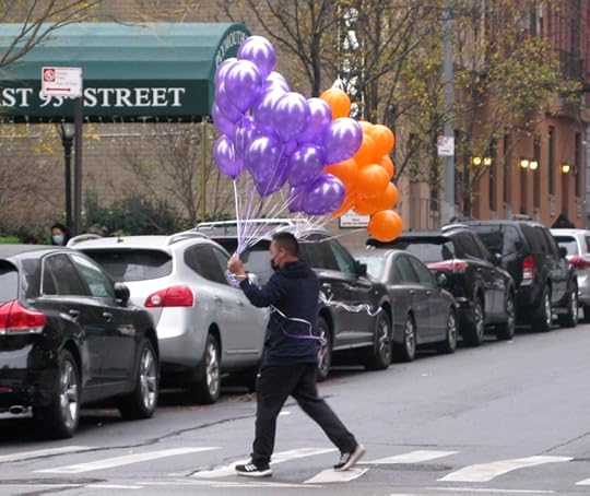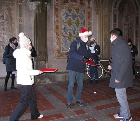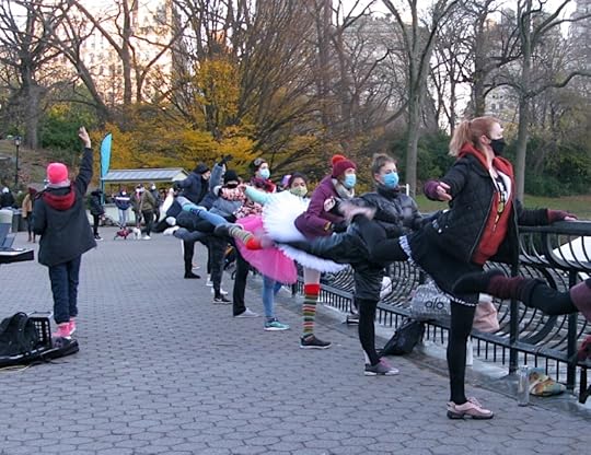 I got to sing carols in the park with my choir, The Choral Society of Grace Church. It was great, but I thought we were going to end with the Hallelujah Chorus and we didn’t. I don’t think our director, John Maclay, thought we were up to it given we haven’t been singing regularly since March. (Maybe he was right, maybe not.) This is John handing out our music. The picture that follows is of a ballet class we passed by on our way home.