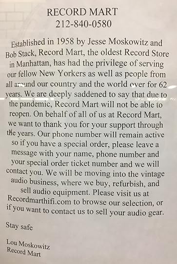 The pandemic continues to break my heart. Since I started working at the ASPCA I’ve been passing by this store inside the Times Square subway stop, Record Mart. I love it because I’m a nostalgia junkie and they always had great hifi nostalgia displays. So I was very sad to see this note pictured on their shuttered store when I returned to work at the ASPCA Hospital last month. I’m glad that they will continue online, but I will miss their window displays.