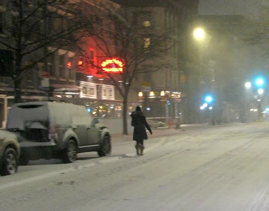 My pictures make it look like it wasn’t much of a storm, but it was. This was one of the first shots I took. This is my block, looking back towards my building, where you can rent an apartment and be my neighbor according to the sign. Maybe I should go out and get more shots now, because it continued to snow throughout the night. It should be more dramatically snowy now.