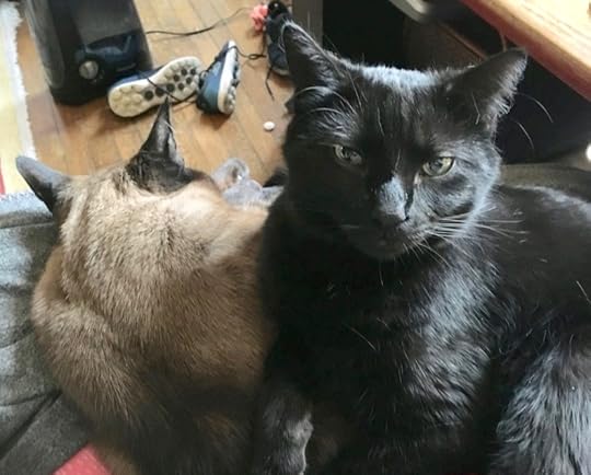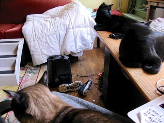 This is all three of them chilling out together. Bleeck is on my lap and that is Bodhi and Bali on the desk, distracted by something in the window. Hopefully a bird. And not Godzilla. (That was a big fear of mine as a child, that Godzilla might arrive at any moment. Or, that a volcano would erupt and I’d have to run from the lava.)