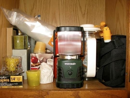 I now have an Emergency Cupboard in addition to my Go Bag. This is for hunkering down. I wanted all my power outage supplies in one place so I don’t have to go searching around for them when the lights go out. As you can see, I’ve got my battery operated lantern, battery operated radio, (that’s the black thing on the right) a manual coffee press, candles, plastic and staples in case a window is blown out … hmmm. That’s it, it seems. I’ve got a flashlight closer by on a shelf, and one in my purse, and a drawer full of batteries.