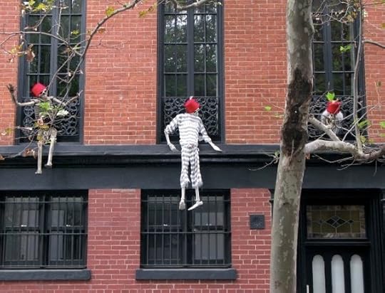 Three happy, fez-wearing skeletons on Bleecker Street (which was named after my cat).
