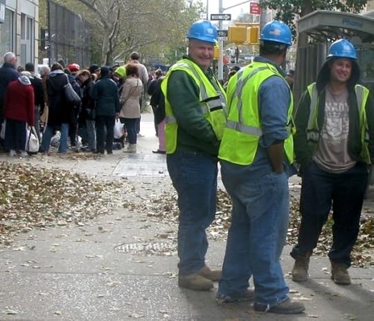 Con Ed employees by the generator they set up so people could recharge their phones and computers. My grandfather worked for Con Ed his entire life so I have a soft spot for Con Ed employees. He never missed a day of work and one day, when he didn’t come in, one of his fellow employees joked, “Oh! Walter didn’t come in today, he must be dead.” And he was!