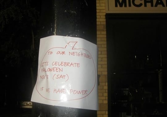 Wishful thinking on the part of one of my neighbors. I thought it was a great idea when I saw it, and we did get our power back yesterday morning. But I’d spent the day cleaning up and I was just too exhausted to leave the house last night. I’m guessing most of us were feeling the same.