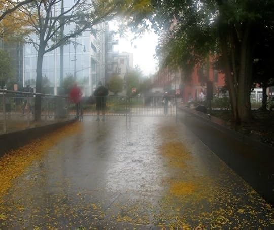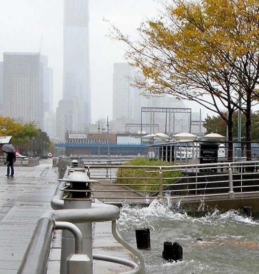1:15pm: I went down to the river and took some shots. The rain is picking up a little, but it’s still not terribly windy. Down at the river the water level is higher, but nothing to write home about. That’s One World Trade in the background.
