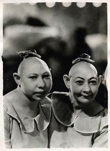 “Pip and Flip were twins who were often advertised as coming from the Yucatan of Mexico (although sometimes also from Australia). They were actually born in New York and the sisters ‘real’ names were Elvira and Jenny Lee Snow. They suffered from the birth defect of microcephaly which contributed to their “pinhead” physicality. They often worked in Coney Island side shows during the 1930′s. They appeared in the 1933 MGM movie Freaks, directed by Tod Browning.”