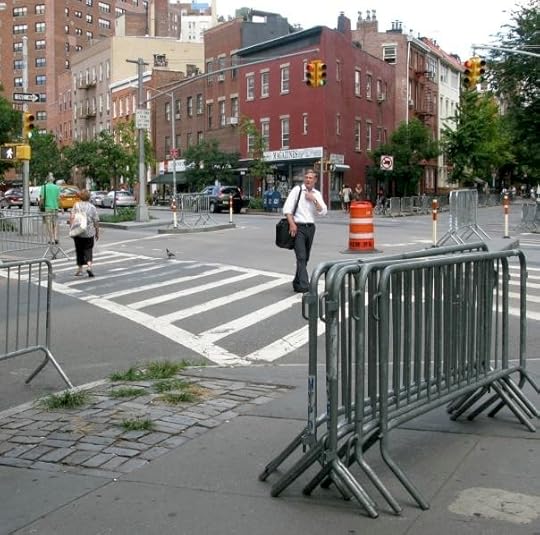 I may have my camera back tomorrow. I took this last year, but didn’t post it because it’s not really a picture of anything. Barack Obama was in town and he drove through my neighborhood, except I missed him. This is just the aftermath, a sad picture of what I didn’t see, of barricades that someone had already started to put away.