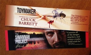 2. Bookmarks. These are printed on heavy weight card stock paper, with two-sided full color printing, and gloss to protect against fingerprints. Available for all my thriller series and my stand-alone suspense novels.