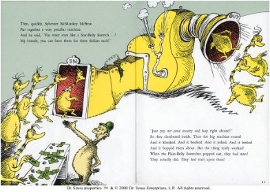 But where did they get this money? In the entire book, the Sneetches have neither homes nor jobs nor clothes (it's cool, they're birds). Maybe their economy is just never shown, or maybe they are the world's most successful beach bums, spending vast welfare checks only on marshmallows and frankfurters.