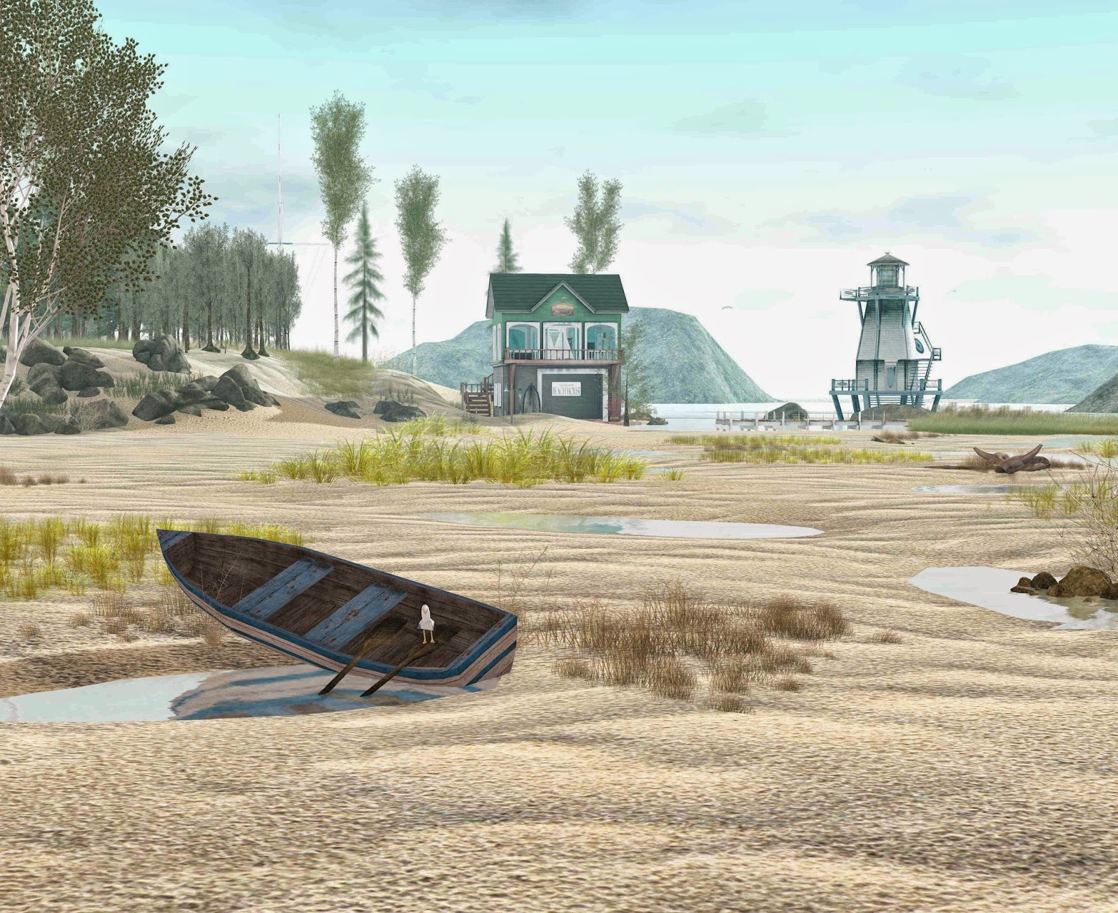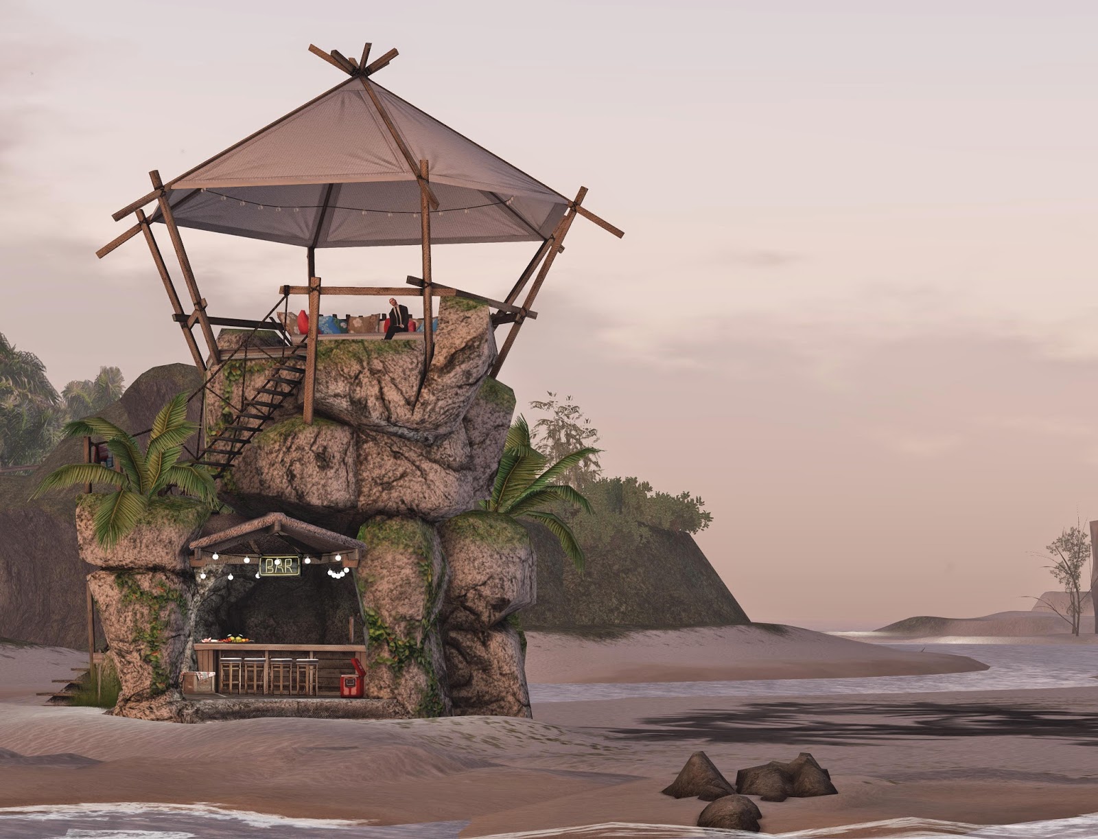The three islets which comprise the sim are open, sandy isles spotted with palm trees. Each has a single feature: on the first the ruins of a house by Kendra Zaurak; on the second an incredibly detailed rise of Alex Bader's plants and moss-covered logs and one of those source-less waterfalls that ever-so slightly irritates me (my bad, entirely); on the third a gorgeous beach bar by Eduardos Ducatillon.