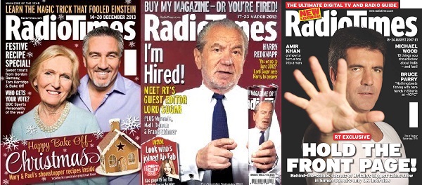 This would have been unthinkable until relatively recently in the BBC's history. I freely admit to liking Bake Off, but the key point is that it shouldn't needadvertising this way: it's a much-loved and highly-rated programme on BBC1, and twenty or thirty or forty years ago, the Radio Times would have accepted it as such while putting an obscure newproject on the cover. Likewise The Apprentice, which personally I'd never watch in a hundred lifetimes. The third example here isn't even worth mentioning by name.