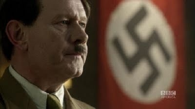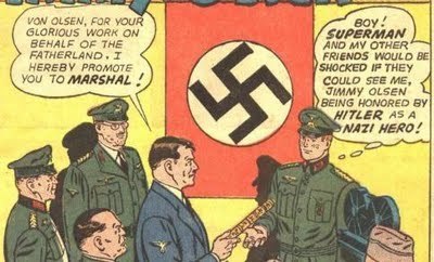Hmmm. On the other hand... let's look at this scene again. A gormless-looking boy-man with a bow tie fixation, being thanked by Adolf Hitler for obvious "shock" value, even though he's clearly out of his depth in Nazi Germany and we're used to seeing a real extra-terrestrial champion deal with this type of situation. Why does that remind me of something?