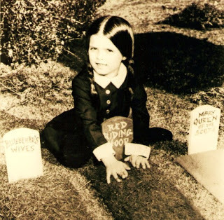 or one night, and I find red wigs to always look like bad yarn. Wednesday Addams is a natural, but almost too much so. Friends would say, "Why no costume this year?" Plus, all my dolls are in storage (Yes, I have a sizable doll collection, mostly Barbies.) and I need a baroque doll (which I do have, yet can't get to easily) so I can pop off her head. You know, as in Wednesday's Marie Antoinette doll?