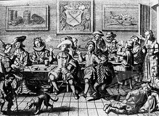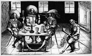 Drinking and smoking in a 17th century innHaving "directed them the safest way," Gounter went to findWilmot, and all the men gathered. Whenthey reached "Brawde-Halfe-Penny, a little above Hambledon, the King spake tothe Colonel: 'Canst thou get mee a lodging hereabout?' The Colonel told him that his Cozin Hyde'shouse aforesaid was taken up for him and was very convenient, beeing neere andin the way. But whether his Majestiethought it to publick a place, or what other reason I know not, hee said, 'knowyou noe other?' 'Yeas, may it please your Majestie, I know divers yeomanly menwhere for a night we may be welcome. Andhere is one whoe married my sister, whose house stands privatly and out of theway. 'Lett us goe thither,' said theKing.