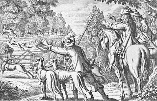Hunting fallow deer with greyhounds"The Colonel brought the greyhounds, and beate with my Lordand his cozin untill his tyme served, and then left them, resolving to ride untillhe mett the King. And just as he came toWarneford townes-end from old Winchester, he met Colonel Phillips conducting theKing. Beeing near the houses, theColonel ridd by them and tooke noe notice, went to an inne in the towne, calledfor some beere and tooke a pipe, and stayed soe long, that they were atop oldWinchester before he overtook them."