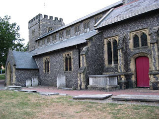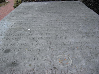 "Captain Tettersell's grave is just to the left of the red door."His headstone reads, in part, "Captain Nicholas Tettersell, through whose prudence, valour and loyalty Charles the Second King of England and after he had escaped the sword of his merciless rebels and his fforces received a fatall overthrow at Worcester Sept 3 1651 was ffaithfully preserved and conveyed into Ffrance, departed this life the 26th. day of July 1674. Approved ffaith honour and loyalty, In this cold clay he hath now tane up his station, At once preserved ye church the Crowne and nation, When Charles ye Greate was nothing but a breath, This valiant soule slept between him and death, Usurpers threats nor tyrant rebells froune, Could not affraight his duty to the Crowne, Which glorious Act of his for Church and State, Eight Princes in one day doth Gratulate, Professing all to him in debt to bee, As all the World are to his Memory."