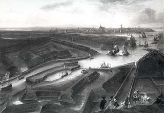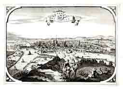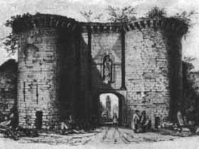 17th century drawing of St. Hillary's Gate into Rouen"We stayed at Roan one day to provide our selves betterCloathes and give notice to the Queene my Mother (who was then at Paris) of mybeing safely Landed. After which settingout in a hired coach I was mett by my Mother with Coaches short of Paris, andby her conducted thither, where I safely arrived."