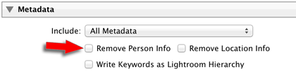 Finally, in the dialog for my Facebook export or publish, I make sure that I do not strip people information. The option to so do is in Lightroom's standard “Metadata” section of the Publish or Export Dialog: