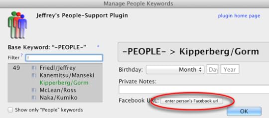 a Facebook account with each person that I intend to tag at Facebook. I do this via my People Support's “Manage Keyword People” dialog,