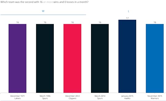 在主场以97-83击败太阳之后,马刺成为NBA历史上第11支单月保持不败的球队,他们在1996年3月取得了16胜0负的战绩,并追平由湖人保持的单月赢球场次纪录(1971年12月获得16胜0负的战绩)。但是这一纪录后来被老鹰刷新,他们在2015年1月取得17胜0负的战绩;此外,马刺(2014年3月)、快船(2012年12月)和勇士(2015年11月)都曾取得过单节16胜0负的战绩。