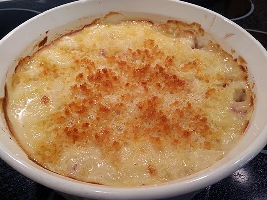 Bake at 350 for 25 - 30 minutes, or until bubbly. (I usually turn the broiler on for a minute or two to make sure the bread crumbs are browned. Because as Anne Burrell would say, "Brown food tastes good!")