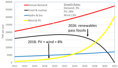 Renewables on track to totally replace fossil fuels by 2032.
