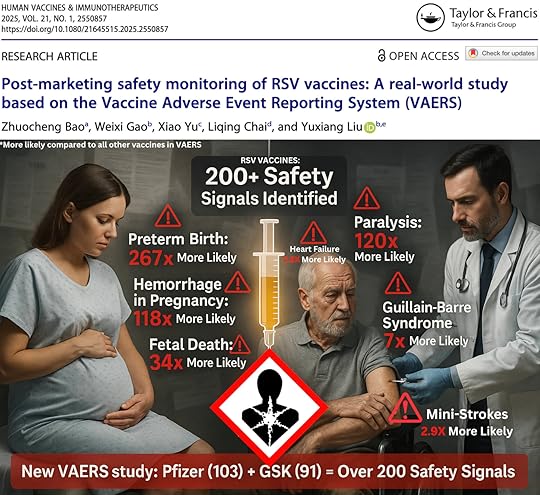 Key Safety Signals — Compared to Other VaccinesGSK Arexvy (RSVPreF3)Ascending flaccid paralysis: ~120× more likely — ROR 119.56; IC 6.03Areflexia (loss of reflexes): ~20× more likely — ROR 20.03; IC 4.14CSF protein increased (neuro injury marker): ~11× more likely — ROR 11.42; IC 3.41Transient ischemic attack (mini-stroke): ~2.9× more likely — ROR 2.89; IC 1.51Guillain-Barré syndrome (GBS): ~6.9× more likely — ROR 6.85; IC 2.70Immune thrombocytopenia: ~4.1× more likely — ROR 4.14; IC 2.01Congestive cardiac failure: ~2.8× more likely — ROR 2.79; IC 1.46Pfizer Abrysvo (RSVpreF)Premature delivery: ~267× more likely — ROR 266.61; IC 6.20Preterm premature rupture of membranes: ~203× more likely — ROR 203.27; IC 6.09Premature rupture of membranes: ~152× more likely — ROR 152.39; IC 5.94Hemorrhage in pregnancy: ~118× more likely — ROR 118.43; IC 5.78Fetal death: ~33.8× more likely — ROR 33.82; IC 4.68Induced labor: ~101× more likely — ROR 101.43; IC 5.68Cesarean section: ~121× more likely — ROR 120.87; IC 5.79Guillain-Barré syndrome (GBS): ~8.5× more likely — ROR 8.49; IC 2.96Facial paralysis: ~3.4× more likely — ROR 3.41; IC 1.73Immune thrombocytopenia: ~3.6× more likely — ROR 3.55; IC 1.79Platelet count decreased: ~5.0× more likely — ROR 4.98; IC 2.25These aren’t just nuisance side effects. They include paralysis, strokes, cardiac failure, immune destruction, and pregnancy complications. For Pfizer’s vaccine — marketed directly to pregnant women — signals included hemorrhage in pregnancy, preterm birth, fetal hypokinesia, and fetal death.