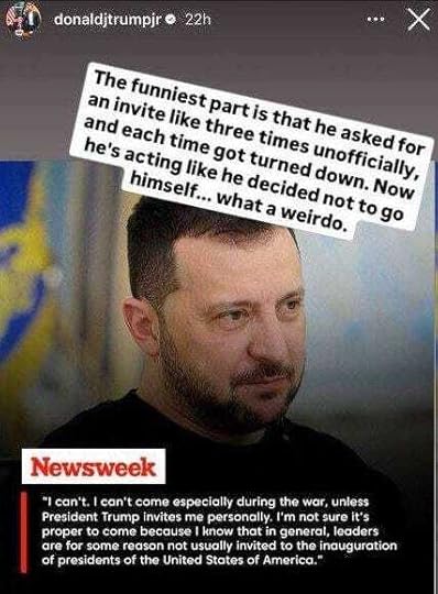 Markedly, Zelensky was not invited to Trump’s inauguration. In a January 6th interview with Newsweek, the Ukrainian President – typically never one to shy away from international jollies – said he was unable to attend, as it wasn’t “proper” to do so “during the war”. Amusingly, Trump’s son Donald Jr. has rubbished Zelensky’s narrative, claiming he – “a weirdo” – had specifically “asked for an invite” on three occasions, “and each time got turned down.”
