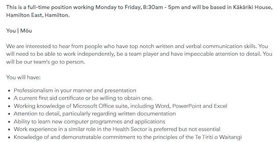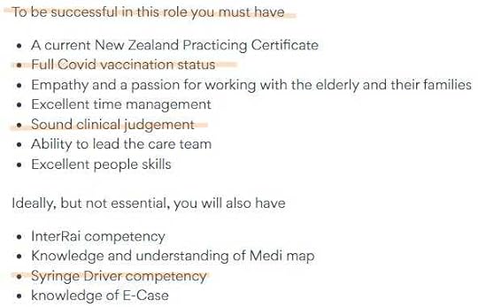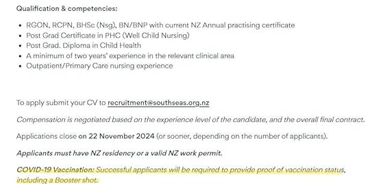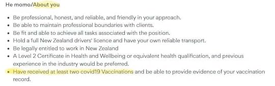 Be eligible to work in New ZealandBe registered with the Nursing Council of New ZealandHave a current practicing certificate with the Nursing Council of New ZealandBe fully vaccinated against COVID-19 (!!!)Have previous experience in Primary Healthcare setting or Community HealthBe interested in nursing in a Primary Health team who have a focus on working with and improving the health outcomes for Maori and Pasifika clientsHave an understanding of the importance of Te Tiriti o Waitangi, Te Ao Maori and other cultural competenciesDesirable attributes are Independent Vaccinator, Smear taker, with experience in B4S’s, phlebotomy and managing chronic conditions. (my emphasis)In addition: “The successful candidate will demonstrate the ability to work in a variable workflow environment, build strong report with team members, have good communication and interpersonal skills, and a positive “can do” attitude.” Sound like you? The advert asks. (are they taking the piss?)
