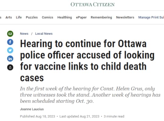 Jennifer is not the only police detective to figure out the connection; Helen Grus in Ottawa found the same thingIn Canada, if you are a police officer and suspect that vaccines cause SIDS, they will prosecute you. It seems that is illegal in Ottawa to question the safety of the vaccines:
