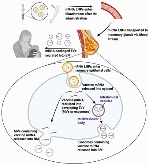 The synthetic mRNA is packaged into extracellular vesicles (EVs) and secreted into breast milk. EVs are similar to the body’s own lipid nanoparticles that are naturally present in breast milk.This process, a natural way for mothers to transfer RNA to their babies, is mimicked by the synthetic mRNA.The synthetic mRNA lipid nanoparticles enter mammary epithelial cells responsible for producing milk.The mRNA is released into the cytosol (the clear, colloidal area) of these cells and could be packaged into EVs or excreted by various mechanisms such as exosomes, along with breast milk components.The EVs do not express the spike protein but serve as carriers for the synthetic mRNA.The study found the mRNA in the breast milk was a degraded form with only 12-25% efficiency compared to the original vaccine.Campbell emphasized that the only way the mRNA could get to the breast tissue would be if it were “systemically absorbed.”