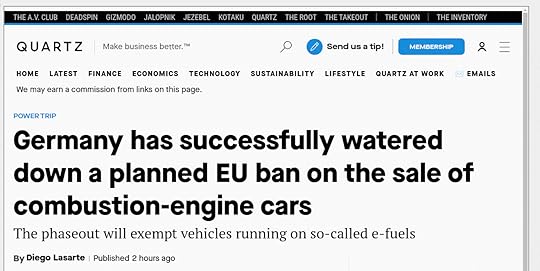 France24, Quartz, and the Wall Street Journal (paywall-free link) report that the EU abandoned its much-ballyhooed transition to electric cars, which was supposed to culminate with a total ban on gasoline cars in 2035.