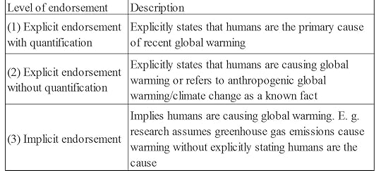 “We analysed a large sample of the scientific literature on global CC [climate change], published over a 21-year period, in order to determine the level of scientific consensus that human activity is very likely causing most of the current GW (anthropogenic global warming, or AGW).”