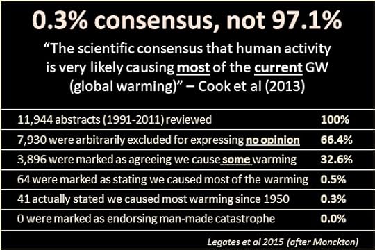 Note that the official “consensus” position—supported though it was by just 0.3% of the 11,944 papers reviewed—says nothing more than recent warming was mostly man-made. Even if that were the case—and the overwhelming majority of scientists take no view on that question, for it is beyond our present knowledge to answer—it would not indicate that global warming is dangerous.