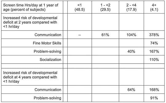 For example in the table above, the value for “communication skills” in year 2 for the 1- to 2-hour group is 61% higher than the number for the <1 hour group. That means that, compared to the group with the lowest exposure, 61% more children in the second-lowest exposure group failed to meet a development milestone.