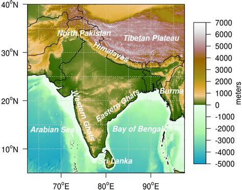 India has an extremely varied climate, with the southern tip reaching the Tropic of Cancer and the northern border reaching as far north as Ohio. The coastal plain west of the Ghats, which receives plentiful rainfall, is characterized by rich agricultural land and one of the most densely populated regions. The Deccan plateau supports dry crops, such as wheat and millet, and is less densely populated.