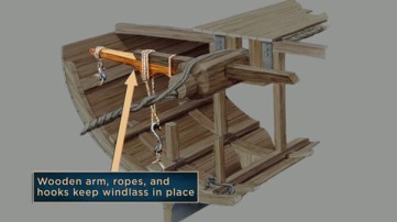 All tiremes had a hypozoma, a loop of heavy rope anchored near the bow and stern to prevent hogging.* It used a windlass to twist and tighten the hypozoma.