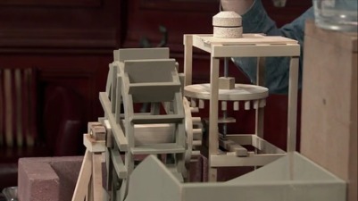 With the undershot wheel, the grinding surface turns on a vertical axis, connecting to the water wheel via right angle gearing.