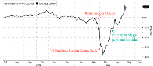 Putin forcing natgas to be paid in rubles, on top of capital controls, has transformed the ruble into the world’s best-performing currency this year. It’s now up more than 11% against the US Dollar since the start of the year, even outpacing the Real’s 9% increase to become the top mover in 31 major currencies tracked by Bloomberg.