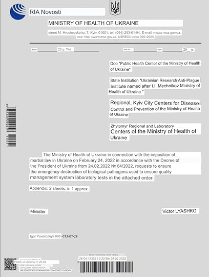 According to the document obtained by the news agency, the Ministry of Health in Ukraine ordered the biological pathogensto be destroyedin a February 24 memo.
