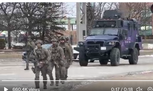 A militarized show of force was used to clear the area of truckers and supporters protesting insane authoritarian mandates. They had snarled traffic and blocked the key trade crossing in Windsor, Ontario.Militarized force removes protestors at border crossing after court injunction ordering them to disperse.