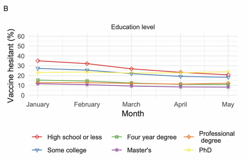 In addition, while the lowest educated saw the largest drop in vaccine hesitancy for the first five months of 2021, those with PhD’s were the most likely to not change their minds.
