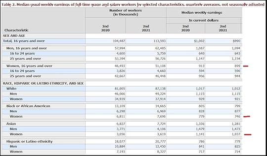 The Bureau of Labor Statistics releases the second quarter national wage rate data today {BLS DATA HERE}. U.S. wages DECLINED 1.2% in the second quarter of 2021 compared to last year. When reviewing the data [Table 2], look at the negative impact to women, specifically Black and Asian women: