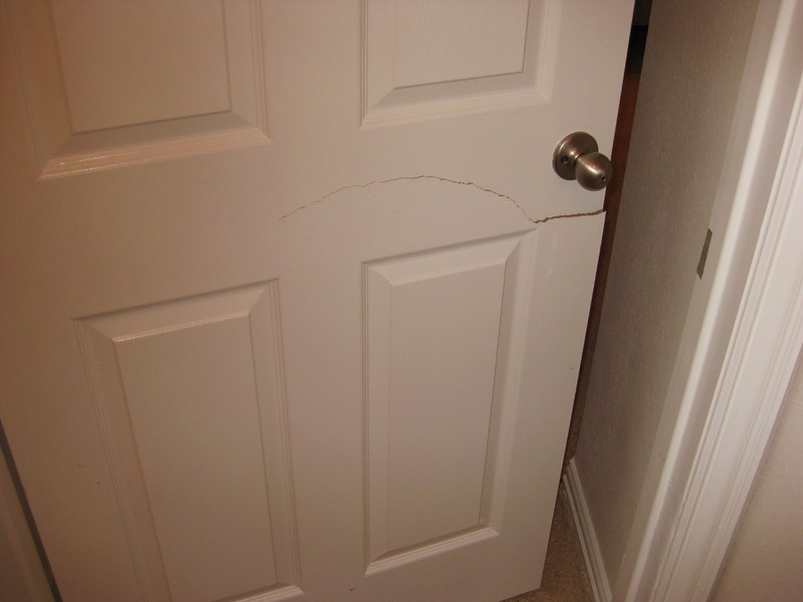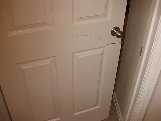 When we got home we were met at the door by Hell Hound. A very excited, Hell Hound. The Hubster and I looked at each other and were like, did we not shut the bedroom door? Then we looked at the bedroom door. It looked shut. We looked closer. See the crack?
