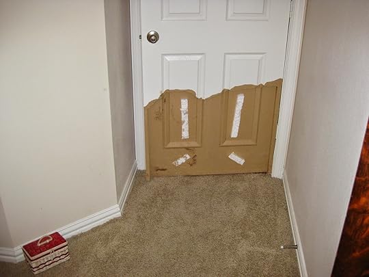 Yep, Hell Hound, while wearing the cone of shame which extended past his muzzle, used his claws to dig up the carpet to the foundation and when the concrete stopped him, he attacked the door, tearing off the lower back half, then bursting through it to escape. On the plus side, I now know how inside doors are constructed. <g>