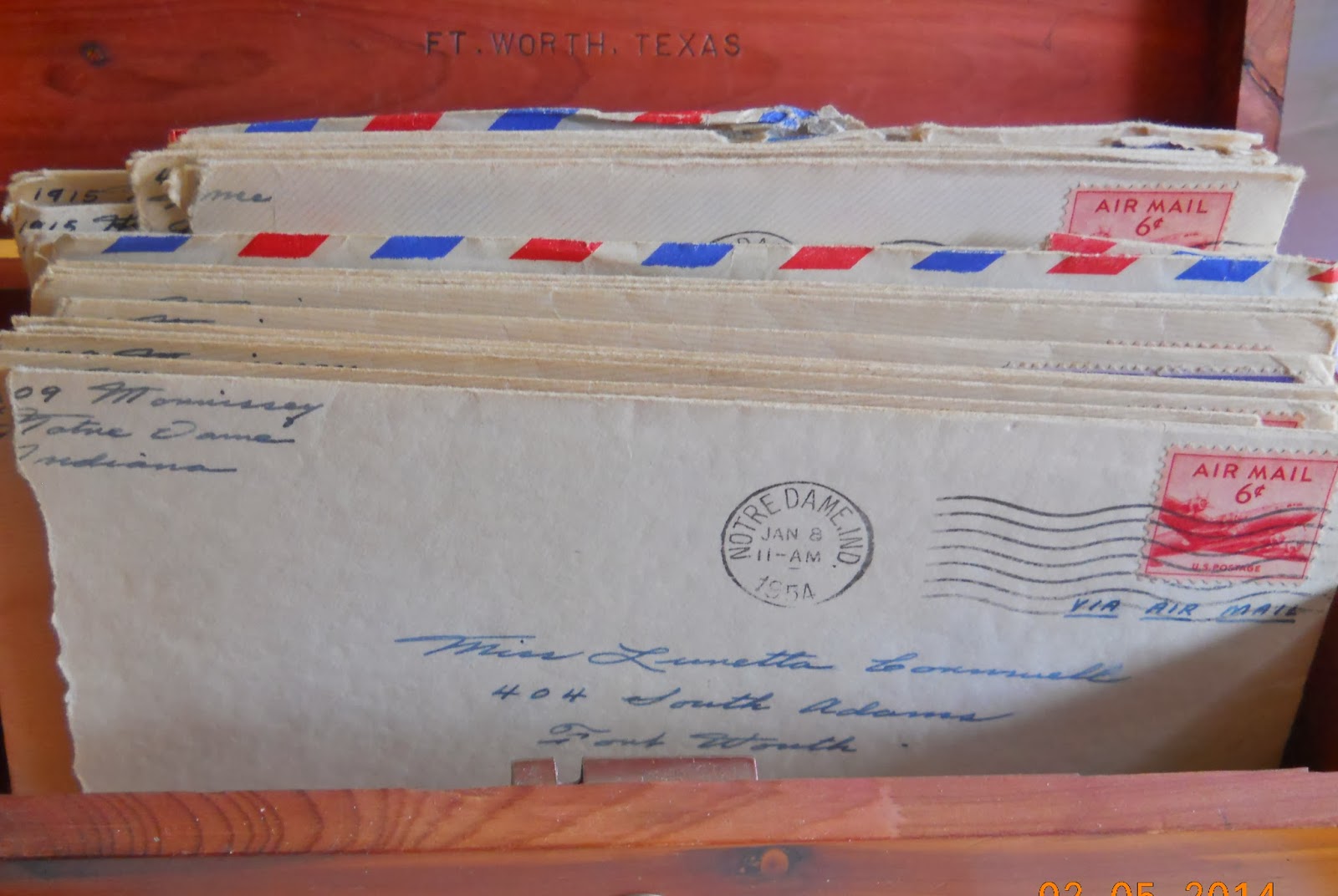 In reality, Daddy was smitten from the first moment he laid eyes on her. But he was really shy. An only child of older parents, he grew up sheltered and his parents had very high expectations for his prospects. That fall he went off to Notre Dame. A year and a half later, he was home for Christmas break and Uncle Jimmy needed a date for his pal, (my dad) so they could double date, and called my mom. Mom says she had a big crush on Daddy, though he hardly spoke to her at all, but he asked her out for the next 2 nights! In mid-January he left for the spring semester at Notre Dame. And, though he returned to Fort Worth during the summer and Christmas breaks, he wrote to her from the Indiana university several times every week.